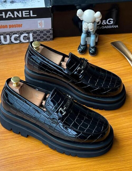 Glossy Croc Platform Loafer: Command attention with this sleek black slip-on loafer. Featuring a high-shine patent crocodile-embossed finish, gold-tone chain detailing, and a bold, chunky platform sole, it's the perfect fusion of classic luxury and modern statement-making style.