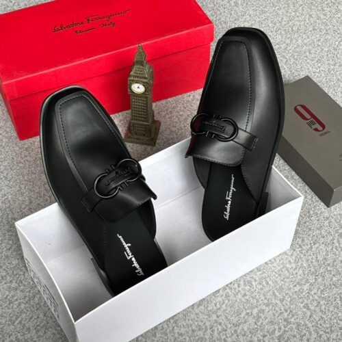 Define your sharp, modern look with this luxurious slip-on loafer. Crafted in jet-black smooth leather, this backless design offers effortless style and comfort. The striking feature is the matte black buckle detailing—a contemporary twist on classic hardware. Perfect for upscale casual events or for elevating your everyday style with a touch of designer sophistication.