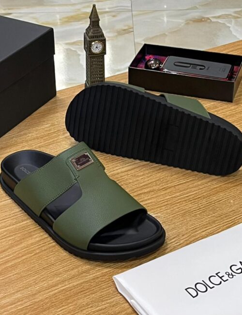 Elevate your casual wear with this luxurious, military-inspired slide. Crafted in rich olive green leather, this slip-on sandal features a wide, comfortable strap accented by a subtle metal designer plaque. The chunky, deeply-grooved black sole provides a modern, rugged look and superior grip. Perfect for achieving an effortless, high-end resort look.