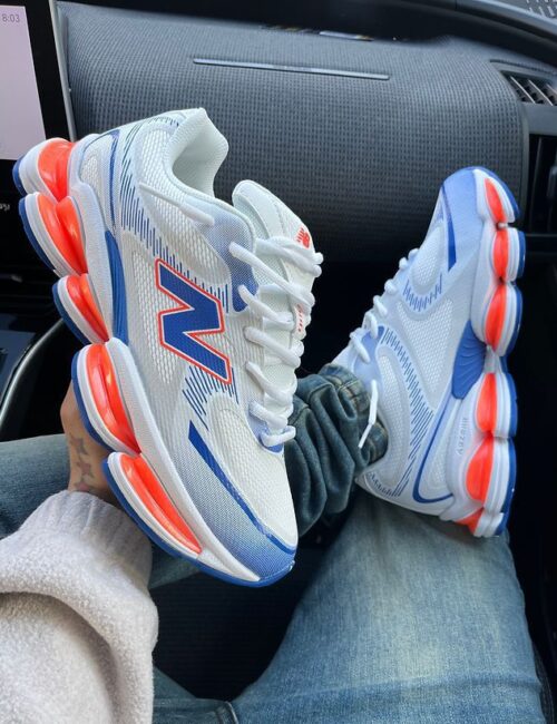 A dramatic and futuristic take on classic New Balance style. The 9060 mashes up elements from iconic 990 models with a highly exaggerated, pod-like midsole featuring visible $text{ABZORB}$ cushioning. The breathable white mesh upper is framed by vibrant blue and neon orange accents, creating a bold, deconstructed look that demands attention. A true statement sneaker for the modern wardrobe.