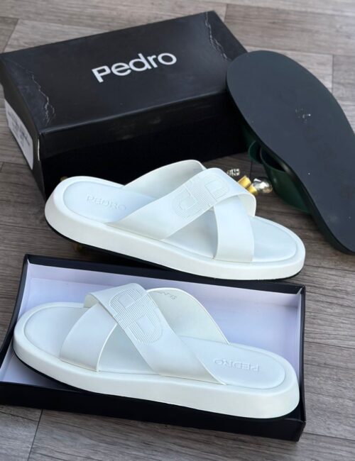 Elevate your casual footwear with the Pedro Cruiser Slide. These contemporary sandals feature a smooth white finish, comfortable contoured footbed, and a clean crossover strap design with subtle branding detail. Perfect for a relaxed yet polished look.