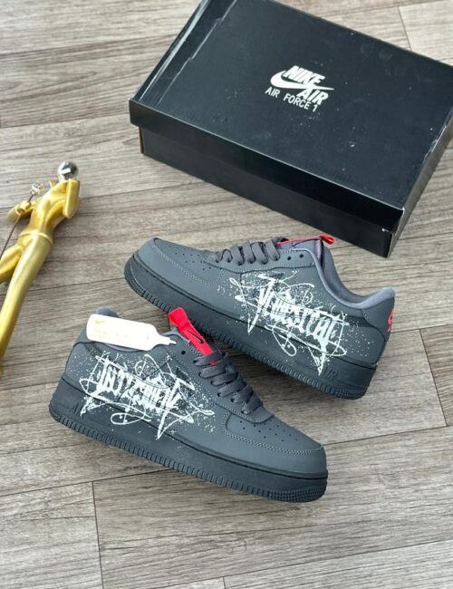 The Nike Air Force 1 Low 'Graphite Graffiti' merges classic comfort with striking street art. This sneaker features a dark gray/graphite leather upper with a bold, splatter-style white graphic and script detailing across the midfoot. Bright red accents on the heel tab and tongue lining provide a vibrant pop of contrast. It’s the perfect choice for anyone looking for a classic silhouette with an edgy, customized look.