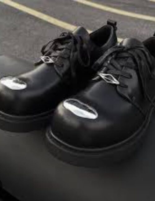 These bold leather derby shoes feature an unmissable design statement. They combine a smooth, black leather upper with a polished silver metal cap toe and a sturdy chunky platform sole. This shoe perfectly blends classic menswear styling with a modern, aggressive edge, making them ideal for creating a standout look.