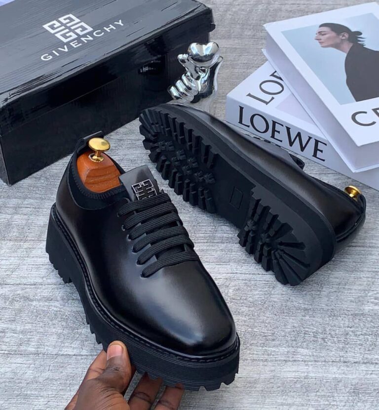 The Aggressive Derby: A modern fusion of classic style and streetwear edge. This all-black derby shoe features a smooth, refined upper set atop a dramatic oversized platform lug sole with subtle tonal branding, delivering a commanding and contemporary look.