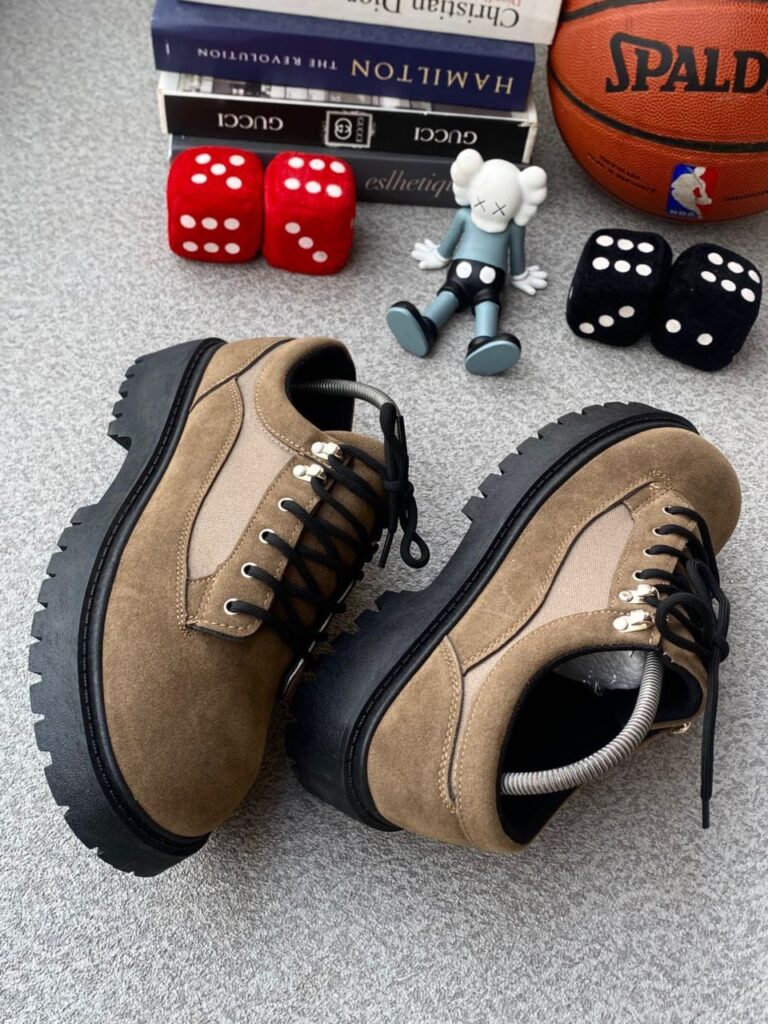 The Ridge Walker: A robust and stylish low-cut boot featuring a rich brown suede upper with contrasting canvas panels. Designed for durability with a heavy-duty black lug sole and secure D-ring lace-up closure, these shoes offer both rugged charm and all-day comfort.