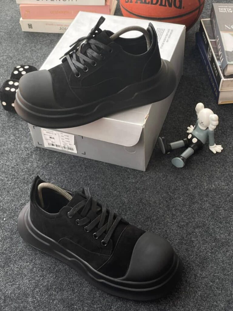 The ultimate statement in monochrome footwear. These all-black low-top sneakers feature a premium suede upper, a matte rubber cap-toe, and a dramatic, chunky sculpted platform sole. Blending minimalist design with an edgy silhouette, they offer exceptional comfort and versatile style that anchors any modern look.