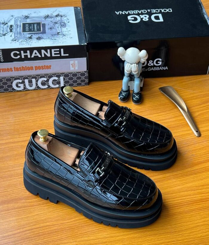 Reimagine classic elegance with these luxurious platform loafers. The shoe immediately stands out with its high-gloss, patent crocodile-embossed finish, giving the rich black material a striking, textural dimension that catches the light with every step.
