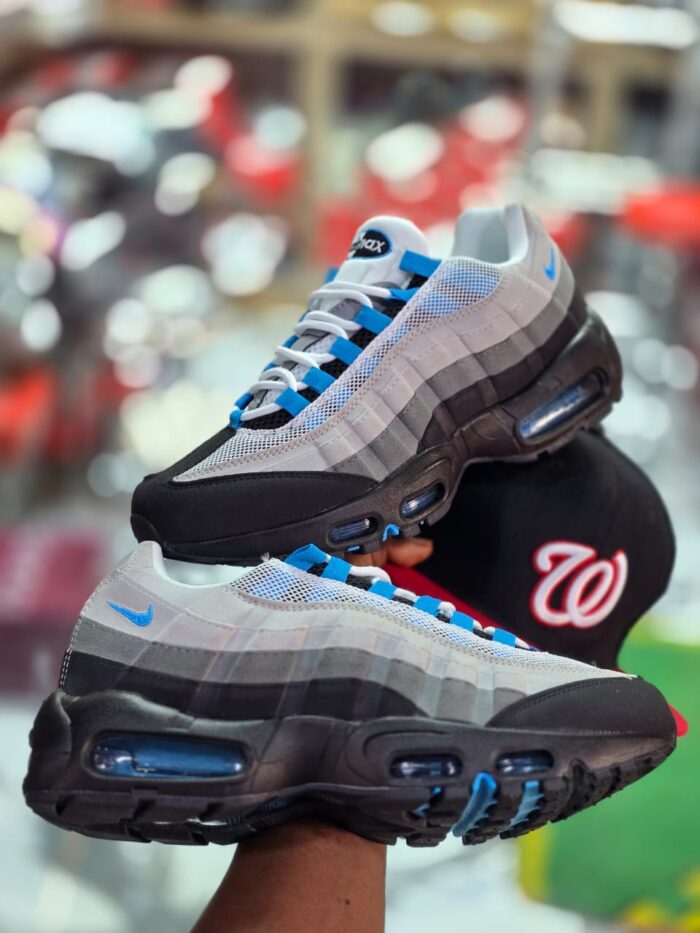 The legendary Nike Air Max 95 returns in a cool grey-to-black gradient, highlighted by vibrant Photo Blue accents on the laces, Swoosh, and visible Air units. Featuring the iconic layered upper and dual visible Air cushioning for a look that’s pure ’90s running heritage.