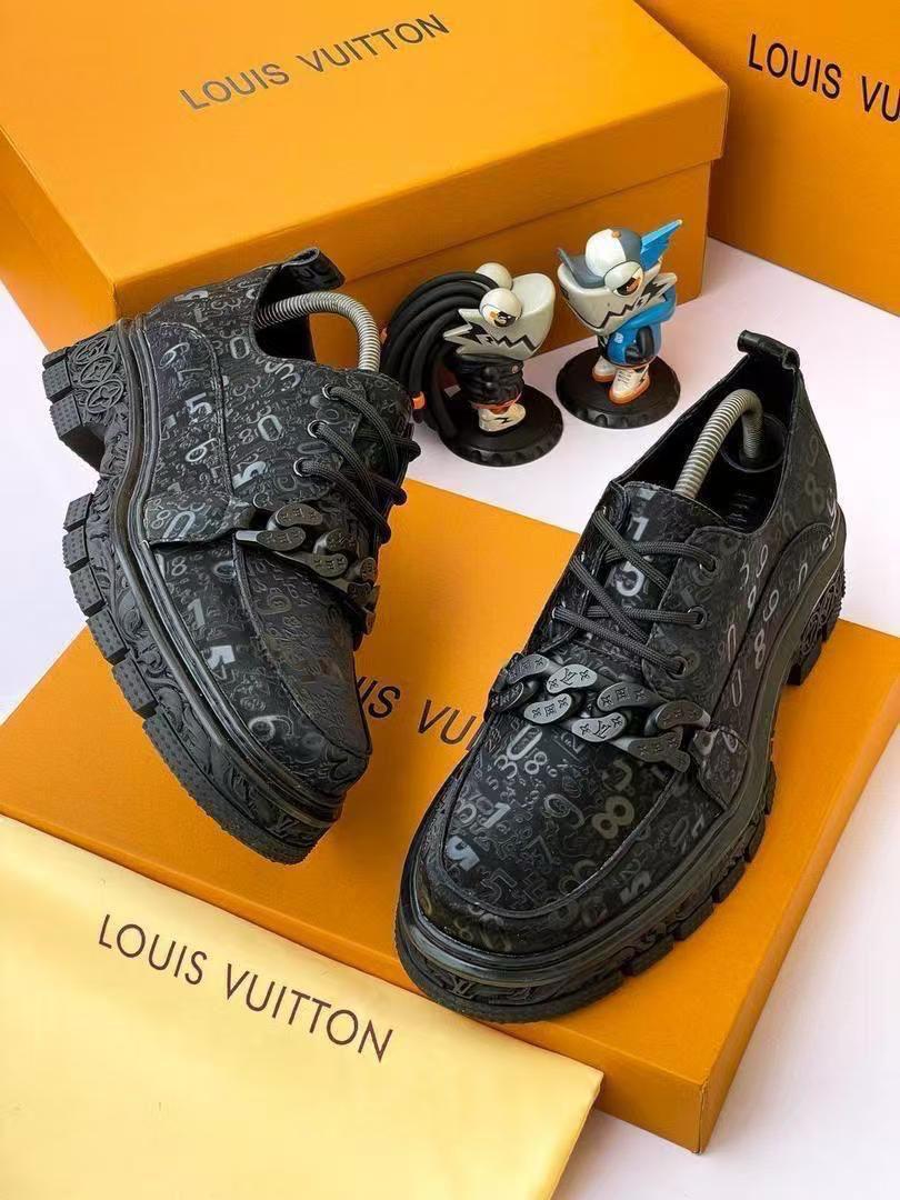 These black patent leather derbies feature a dazzling high-shine finish and are anchored by an age. Detailed with a subtle gold-tone LV signature plaque, this lace-up style delivers commanding height and blends formal elegance with unapologetic street edge