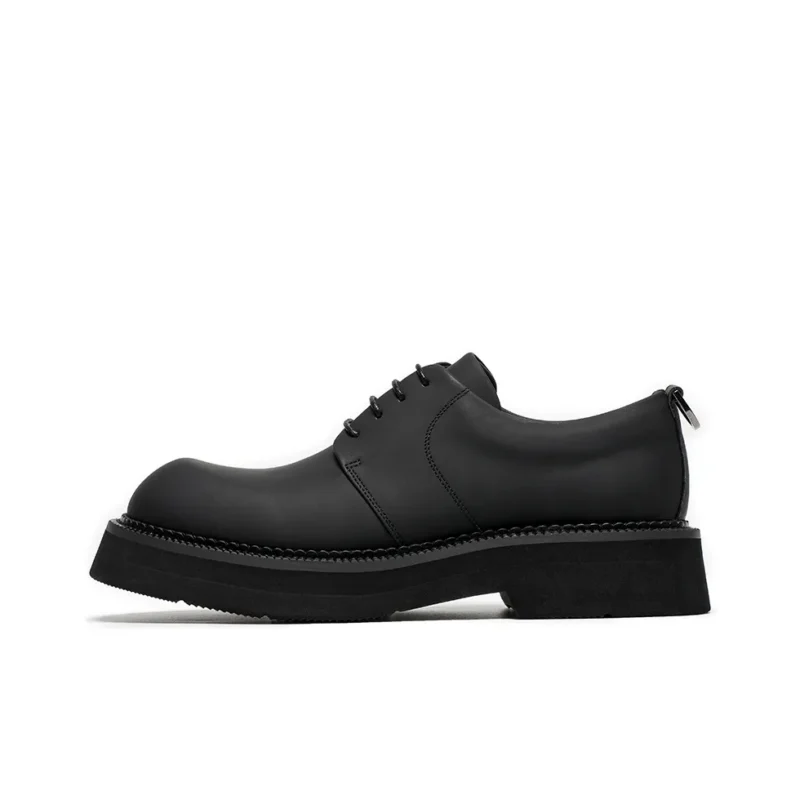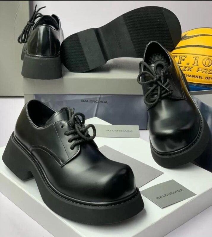 The Stride Platform Derby: A timeless black Derby shoe elevated by a dramatic, oversized platform sole and stacked heel. Featuring a smooth, polished finish and classic lace-up closure, this shoe merges formal elegance with a bold, contemporary silhouette.