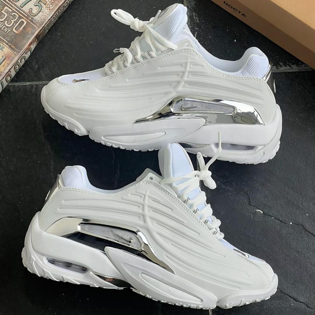 The Nike Nocta Hot Step 2 is the latest evolution in the collaboration between Nike and Drake’s Nocta line. This “White” colorway features a clean, chunky silhouette with distinctive molded synthetic overlays that give it a futuristic look. Chrome accents along the midfoot and heel add a high-shine, premium touch to the monochromatic design. It is built with a visible Air unit in the heel to ensure maximum comfort during daily wear.