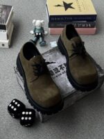 These olive green suede derby shoes offer a soft, luxurious texture that sharply contrasts with the aggressive, all-black chunky lug sole. A comfortable lace-up design built on a statement platform, perfect for adding a grounded, military-inspired edge to your everyday style.