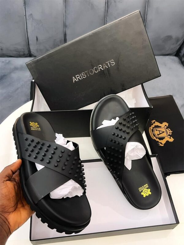 Step out with undeniable confidence in The Aristocrats Gladiator Stud Slide. These sandals take the comfortable, everyday slip-on and transform it into a piece of high-fashion armor. The wide, prominent strap is fully adorned with tonal pyramid studs, giving the slides a commanding texture and a unique, luxurious edge. Crafted in a monochromatic matte black, the entire slide—from the comfortable, molded footbed to the chunky, durable lug sole—is designed for both all-day comfort and maximum style impact. Perfect for adding a bold, distinguished finish to resort wear, designer casuals, or unique streetwear ensembles.