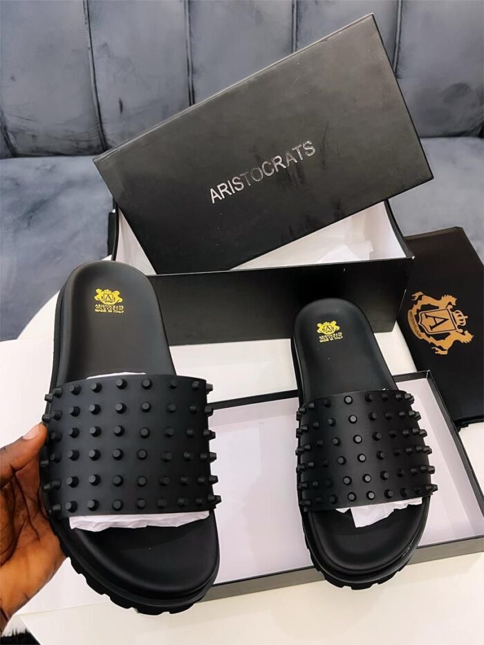 Step out with undeniable confidence in The Aristocrats Gladiator Stud Slide. These sandals take the comfortable, everyday slip-on and transform it into a piece of high-fashion armor. The wide, prominent strap is fully adorned with tonal pyramid studs, giving the slides a commanding texture and a unique, luxurious edge. Crafted in a monochromatic matte black, the entire slide—from the comfortable, molded footbed to the chunky, durable lug sole—is designed for both all-day comfort and maximum style impact. Perfect for adding a bold, distinguished finish to resort wear, designer casuals, or unique streetwear ensembles.
