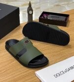 Experience the perfect marriage of rugged style and luxurious comfort with the Dolce & Gabbana Olive Leather Comfort Slide. This slide redefines the summer sandal, bringing a modern, masculine edge to relaxed footwear. The upper strap is crafted from premium, soft leather in a sophisticated dark olive green hue, offering an unexpected and versatile color that stands out from standard black. A small, polished metal plaque is fixed to the strap, providing a discreet yet effective nod to the Dolce & Gabbana brand’s luxury status.