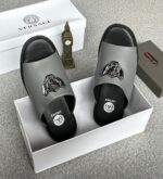 Embrace the ultimate statement in casual luxury with the Versace Medusa Head Leather Slide. This footwear transforms the simple slip-on sandal into a piece of high-fashion artistry, blending comfort with the dramatic aesthetic the brand is known for. The wide, comfortable strap is crafted from luxurious, smooth leather in a sophisticated light gray/stone color, offering a sleek, minimalist contrast to the hardware. Perfect for elevating a resort look, adding flair to summer shorts, or making a strong impression in any upscale casual setting.