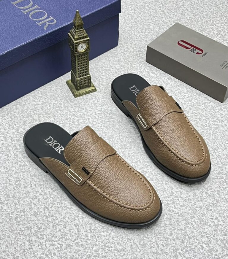 Step into effortless luxury with these sophisticated slip-on mules. Crafted from premium tan-brown grained leather, these backless loafers offer a modern take on a classic silhouette. Featuring a clean penny strap and subtle DIOR hardware, they provide the perfect blend of casual comfort and high-fashion elegance. Ideal for indoor-outdoor versatility and warm-weather style.